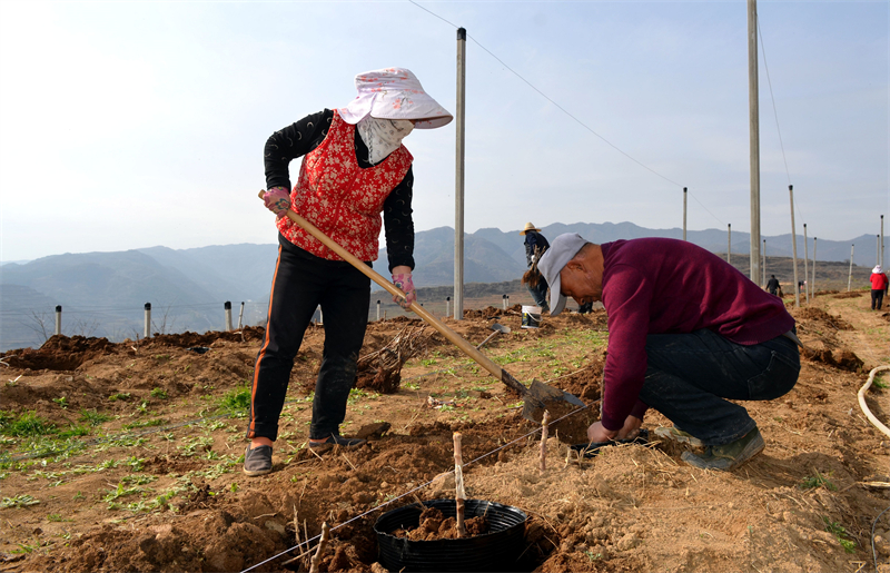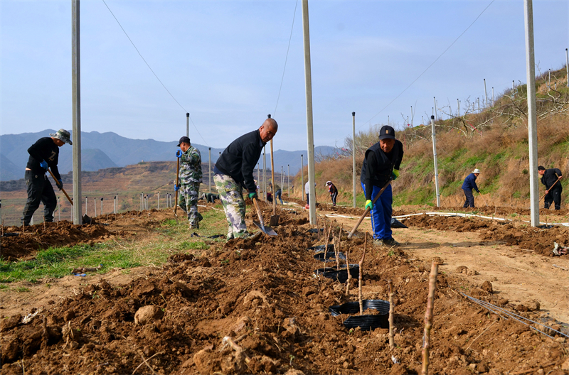 走進(jìn)示范園,新翻的泥土散發(fā)著清新氣息,整齊劃一的定植坑沿田壟延伸,務(wù)工群眾兩兩配合、分工明確,鐵鍬起落間塵土輕揚(yáng),扶苗的村民細(xì)心舒展苗木根系,確保樹苗栽得正、扎得穩(wěn)。